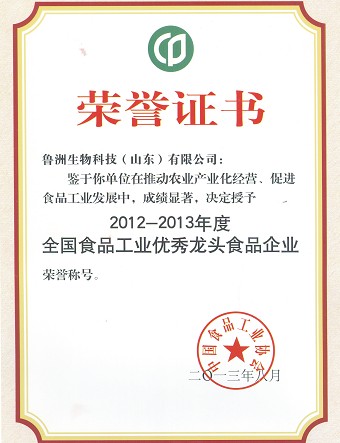 近日,中國(guó)食品工業(yè)協(xié)會(huì)召開(kāi)表彰2012——2013年度全國(guó)食品工業(yè)強(qiáng)縣(市、區(qū))和優(yōu)秀龍頭食品企業(yè)大會(huì),魯洲生物科技(山東)有限公司,被授予“全國(guó)食品工業(yè)優(yōu)秀龍頭食品企業(yè)”榮譽(yù)稱號(hào)。