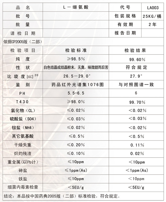 本品為白色結晶或結晶性粉末;用乙醇水溶液重結晶者為無色板狀或磷片狀結晶。無臭,有特殊苦味。熔點約315度。5%水溶液的PH值為5.5-6.5.對熱、光及空氣穩(wěn)定。易溶于水(8.85g/100ml,25度),幾乎不溶于乙醇和乙醚.與亮氨酸的分離困難。比旋度為+26.5°至+29.0°